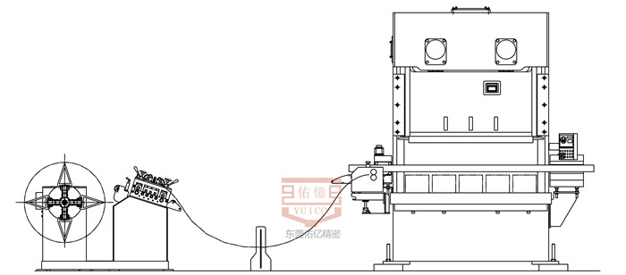 卷料沖壓時,不管是沖床前段還是后段全是自動化操作,此意示圖是GO二合整平機、NC伺服送料機配沖床+多工位機械手