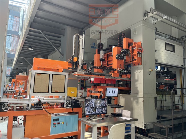 整套自動(dòng)化系統(tǒng)由取料機(jī)械手、磁性輸送帶、NC 三次元機(jī)械手、成品輸送帶組成,配備CCD視覺(jué)系統(tǒng)檢測(cè),整體自動(dòng)化沖壓生產(chǎn)線包含有整體拉伸,邊緣拉伸,旋切切邊,沖孔整平,以及去毛刺修邊等工藝。